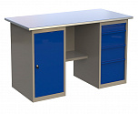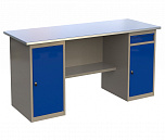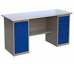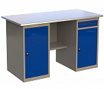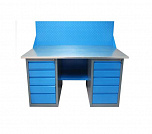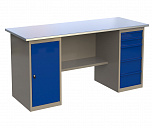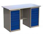 Верстак двухтумбовый поставляется в разобранном виде (4 элемента). Нагрузка на столешницу до 600 кг. Стандартный цвет: корпус - серый глянец RAL 7030, ящики и двери тумб - синий RAL 5017. Размеры:855x1400x700 мм. Масса: 107 кг.