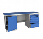 Двухтумбовый. Допустимая нагрузка на столешницу 1000 кг. Опорные элементы выполнены сварными из холоднокатаной стали. Для выполнения сборочных, ремонтных, слесарных, монтажных и других видов работ на производстве, в сервисных центрах, мастерских, гаражах, а также для обучения технологии в учебных заведениях. Комплектуется полкой-стенкой, расположенной под столешницей для удобного размещения габаритного инструмента и оснастки. Размеры верстака: 855x1796x696 мм. Вес: 133 кг. Поставляется в 4 комплектациях на выбор.