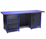 Верстак двухтумбовый поставляется в разобранном виде (4 элемента). Нагрузка на столешницу до 600 кг. Стандартный цвет: корпус - серый глянец RAL 7030, ящики и двери тумб - синий RAL 5017. Размеры: 855x1400x700 мм. Масса: 78 кг.