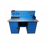 Верстак поставляется в разобранном виде (4 элемента). Нагрузка на столешницу до 600 кг. Стандартный цвет: корпус - серый глянец RAL 7030, ящики и двери тумб - синий RAL 5017. Размеры (ВхШхГ) 855х1400х700 мм. Вес 94 кг.