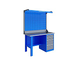 Однотумбовый. Допустимая нагрузка на столешницу 750 кг. Опорные элементы выполнены сварными из холоднокатаной стали. Верстак состоит из столешницы, опоры, тумбы P4 с двумя малыми и двумя большими ящиками, полки-стенки, двойного экрана с кронштейнами и комплекта освещения. Столешница состоит из фанеры марки ФСФ толщиной 24 мм, которая покрыта лаком-антисептиком и листом оцинкованной холоднокатаной стали толщиной 1,2 мм. Размеры (ВхШхГ) 1965x1396x696 мм.