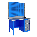 Однотумбовый. Допустимая нагрузка на столешницу 750 кг. Опорные элементы выполнены сварными из холоднокатаной стали. Верстак состоит из столешницы, поры, тумбы P4 с двумя малыми и двумя большими ящиками, полки-стенки и одинарного экрана с кронштейнами. Все металлические элементы покрыты полиэфирной порошковой краской. Столешница состоит из фанеры марки ФСФ толщиной 24 мм, которая покрыта лаком-антисептиком и листом оцинкованной холоднокатаной стали толщиной 1,2 мм. Размеры (ВхШхГ) 1470x1396x696 мм.