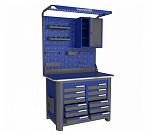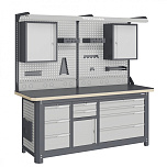 Нагрузка на столешницу 1500 кг. Столешница из листа влагостойкой фанеры марки ФСФ толщиной 40 мм и листом горячекатаной стали толщиной 5 мм. Рама верстака выполнена их холоднокатаной стали. Модуль верстака выполнен сварными. Ящики в модулях устанавливаются на шариковых телескопических направляющих полного выдвижения. Квадратная перфорация для установки крючков, держателей. Размеры: 1982x1993x743 мм.