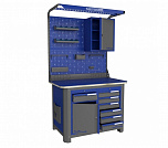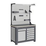 Нагрузка на столешницу 1500 кг. Столешница из листа влагостойкой фанеры марки ФСФ толщиной 40 мм и листом горячекатаной стали толщиной 5 мм. Рама верстака выполнена их холоднокатаной стали. Модуль верстака выполнен сварными. Ящики в модулях устанавливаются на шариковых телескопических направляющих полного выдвижения. Квадратная перфорация для установки крючков, держателей. Размеры: 1982x1193x743 мм