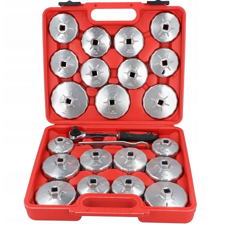 Головки изготовлены из стали. Масляный съемник "чашка" - набор 23 предмета. Применяется с инструментом под квадрат 1/2" или ключом 21 мм. В комплекте: 21 головка для масляного фильтра + трещоточный ключ на ½" + накидной ключ 21 мм, 12 гранный.