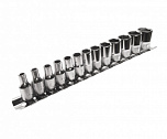 Головки изготовлены из закаленной хром-ванадиевой стали. Полированная поверхность. В набор входит планка крепления и хранения головок.Набор 9 предметов (Е10, Е11, Е12, Е14, Е14, Е16, Е18, Е20, Е22, Е24).