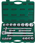 Набор головок торцевых 6-гранных 24 предмета. В комплекте: головка 1/2" - 18 шт, удлинитель 1/2" - 2 шт, вороток с шарниром 1/2", вороток с плавающей головкой 1/2", трещотка 1/2, карданный переходник 1/2".
