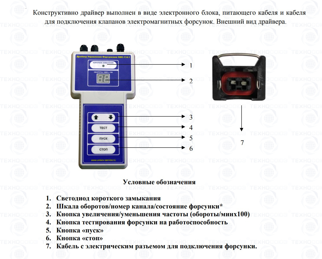 Драйвер управления форсунками (Реаниматор форсунок). Драйвер управления форсунками нового поколения SMC-114 оснащен линейной шкалой показаний имитации -об/мин, датчиком и звуковой сигнализацией в случае замыкания инжектора, автоматической адаптацией под любое рабочее напряжение форсунки. Вместе с УЗВ-ванной позволяет реанимаровать (восстанавливать) работоспособность форсунок. Драйвер легко и удобно умещается в руках механика, имеет сенсорную панель управления.