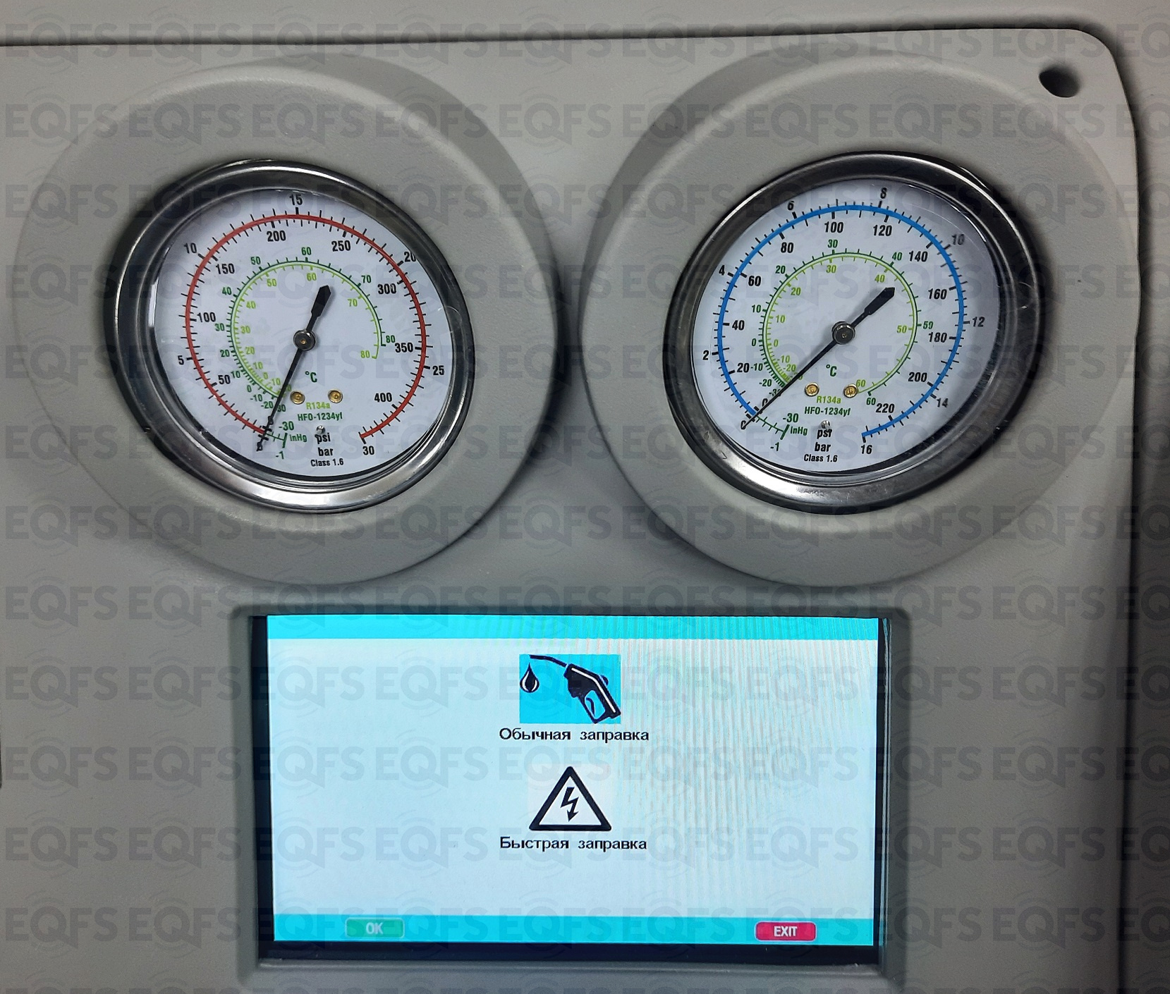 В установке реализована функция дозаправки без откачки и вакуумации. Дозаправку выполняют в ручном режиме, контроль осуществляют по показаниям манометров.