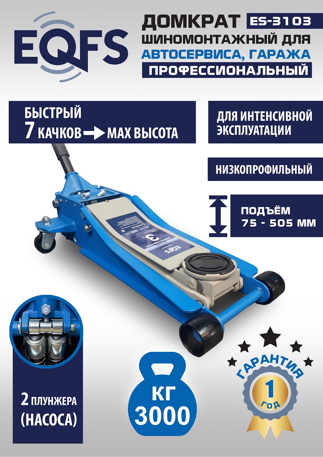 ES-3103 Домкрат подкатной низкопрофильный 3т. (2 шт.)  Гарантия 1 год. Профессиональный. Для интенсивной эксплуатации. 7 качков для поднятия на макс высоту. Подкатной. Низкопрофильный. Двухштоковый механизм. Усиленная конструкция. Быстрый подъем. Имеет повышенную износостойкость. Поворотная ручка, тавотница, лоток для хранения и резиновая накладка на чашку домкрата в комплекте. Грузоподъемность 3 тонны с усиленными ребрами жесткости.  Высота подъема мин / макс - 75-505 мм. ВЕС - 34,5 кг.