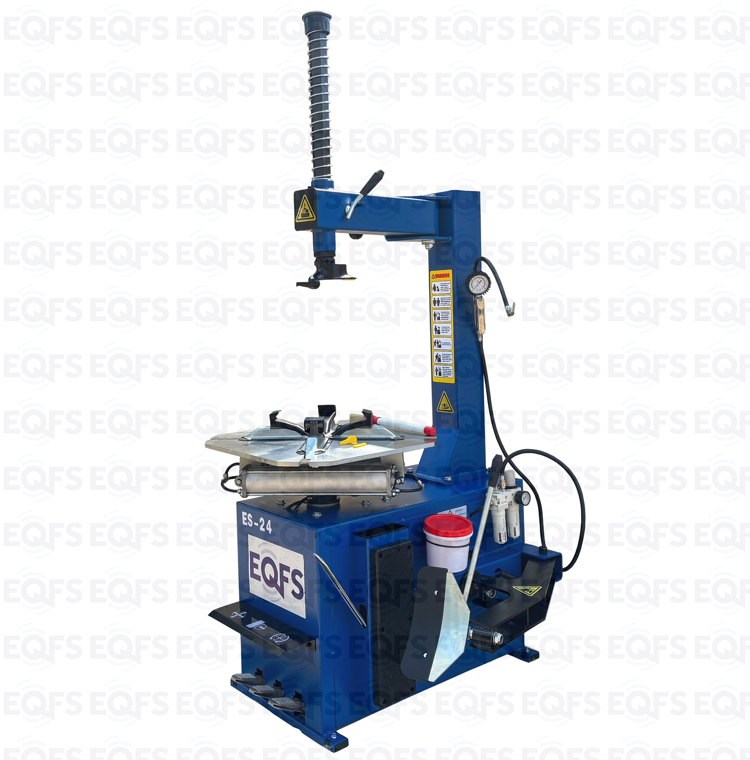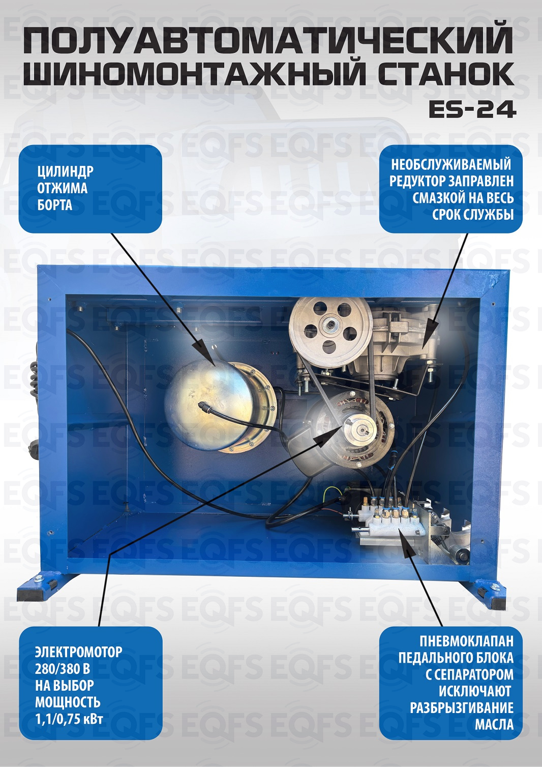 ES-24 Станок шиномонтажный полуавтоматический 11-24"дюйма. Усилие отрыва покрышки 2700 кг. В комплекте: пистолет для подкачки шин + монтажка + пластиковые накладки на зажимные кулачки + регулятор давления с влагоотделителем и манометром. Электропитание на 220В или 380В.