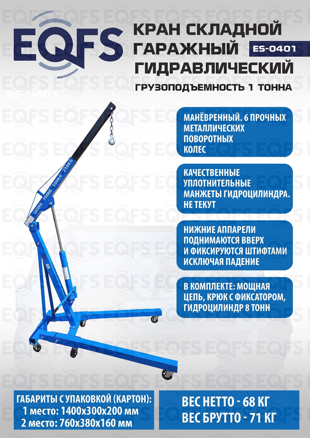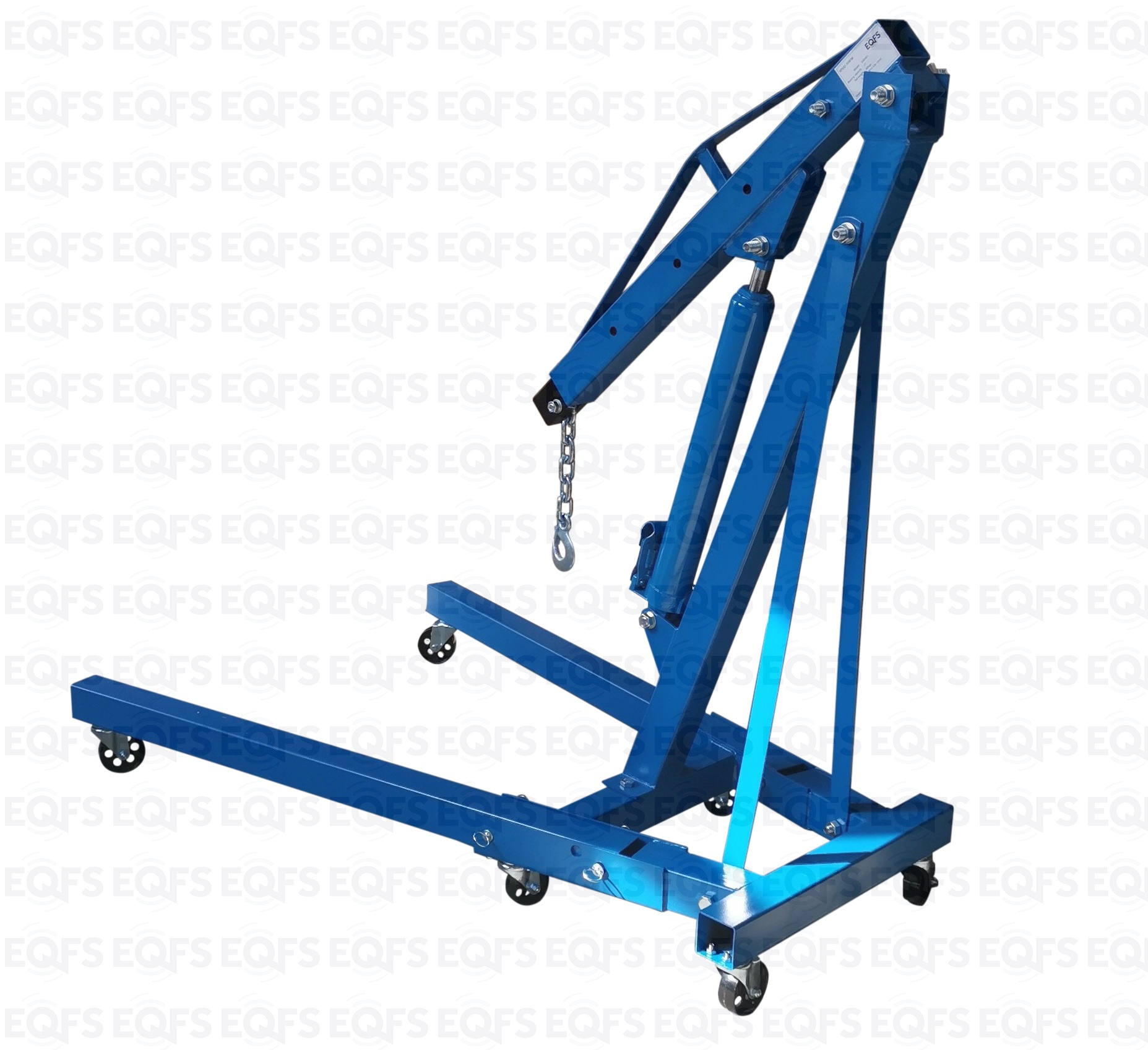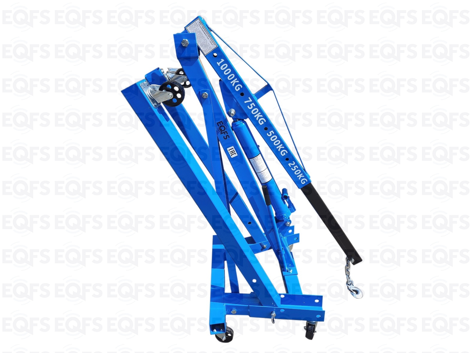 Кран гидравлический 1т. Складной. Для подъёма и перемещения агрегатов автомобиля по гаражу – г/п 1т. Рабочий диапазон стрелы 950-1210 мм. Высота подъёма крана от пола цеха – 0÷2140 мм. Вес: 68 кг. Рабочим приводом крана является гидроцилиндр. Устройство полностью автономно, не требует дополнительных конструкций. Вынос стрелы регулируется в соответствии с максимальной грузоподъемностью крана – 250-500-750-1000кг. Цвет темно-синий.