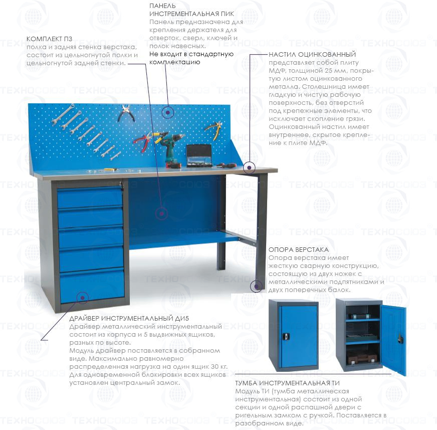 Верстак имеет надежную модульную конструкцию с усиленной столешницей (плита МДФ 25мм, покрытая листом оцинкованного металла).