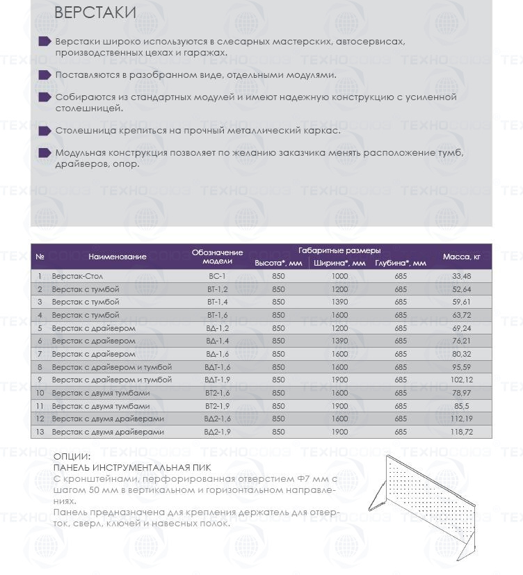 - Верстак имеет надежную модульную конструкцию с усиленной столешницей (плита МДФ 25мм, покрытая листом оцинкованного металла).